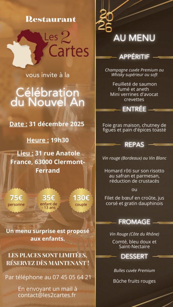 Le présent site est la propriété de LES 2 CARTES établissement situé au 31 Rue Anatole France, 63100 Clermont-Ferrand